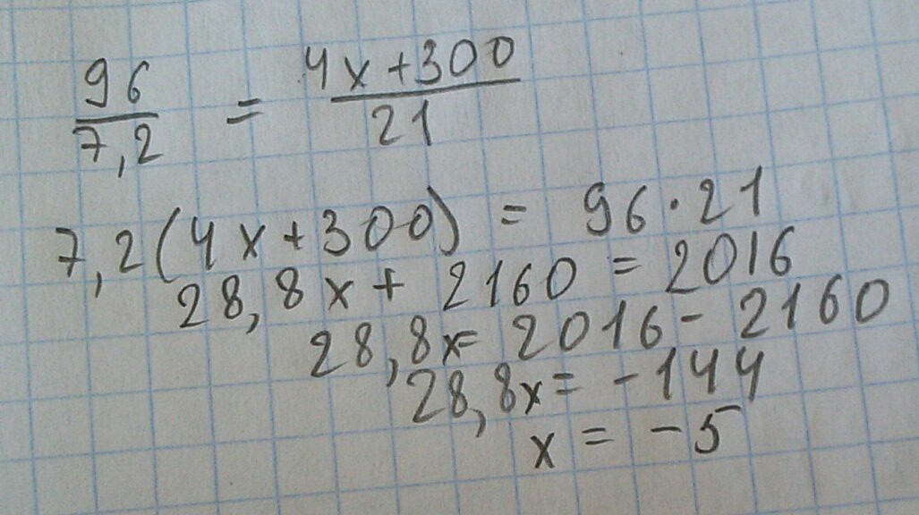 96/7,2=4 х+300/21 96×21=4 х+300×7,2 2016=4 х+2160 -4 х=2160-2016 -4 х=144 х=144/-4 х=-36