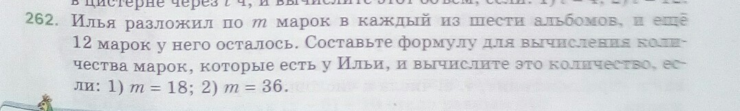 Помогите пожалуйста. номер 262. Илья разложил по m марок в каждый из шести альбомов, и ещё 12 марок у него осталось. Составьте формулу для вычисления количества марок, которые есть у Ильи, и вычислите это количество, если : 1) m =18, 2) m=36.