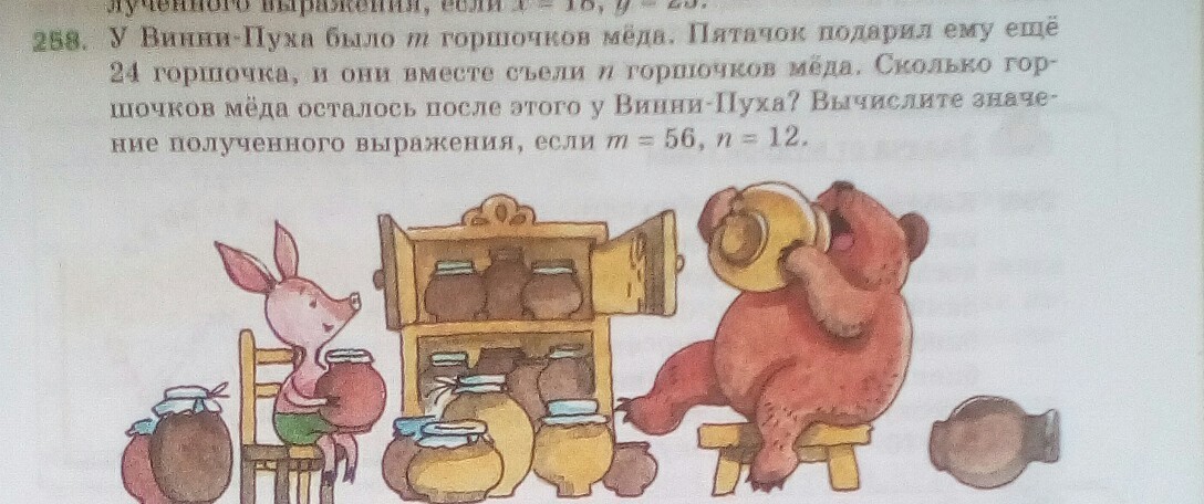 изначально у пуха было м т.е. 56, х затем ему подарили 24 и после они съели н т.е. 12, составим выражение: