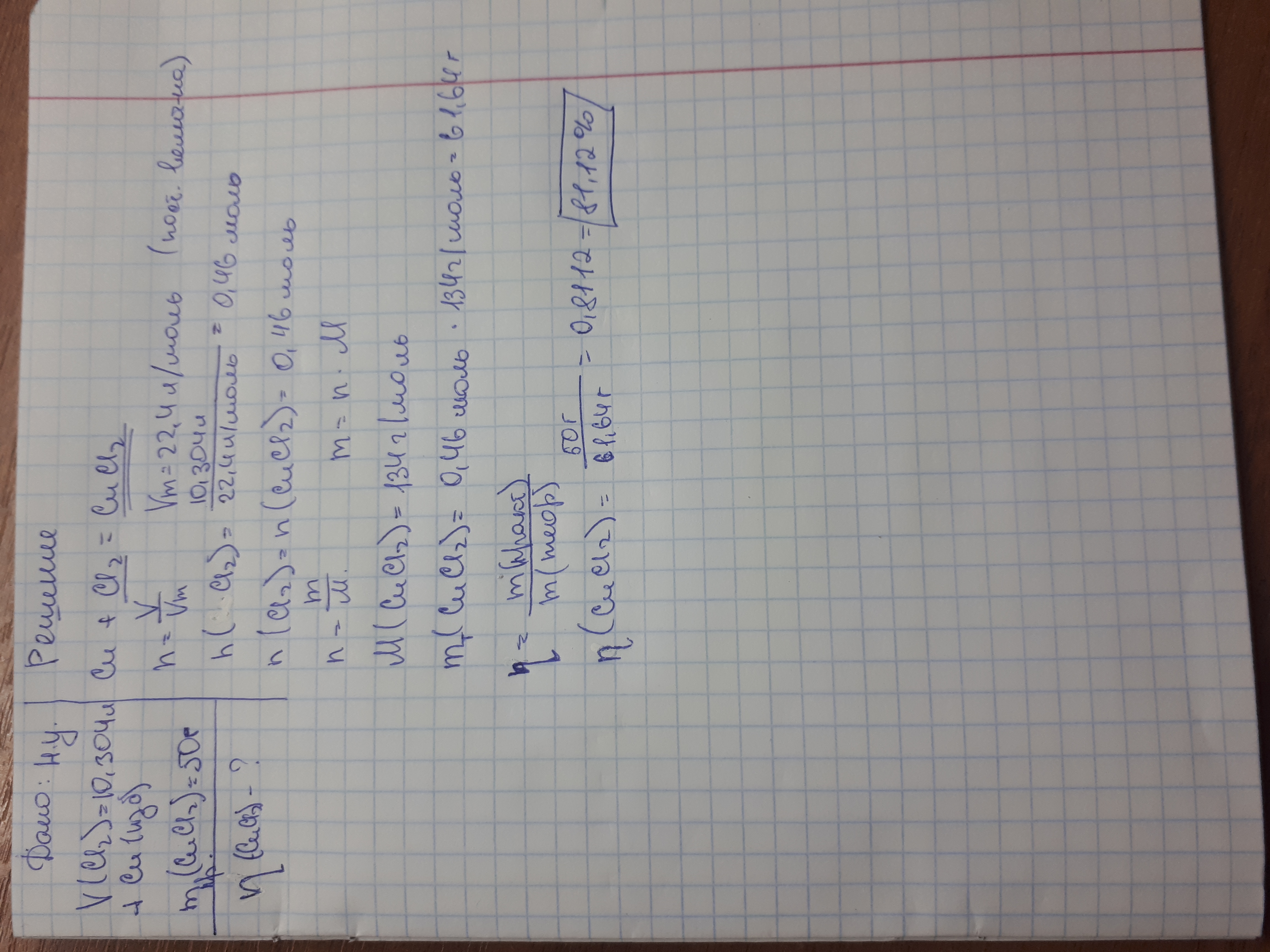 В хлор объемом 10.304л поместили избыток меди и получили 50г. продукта реакции. Сколько % от теоретически возможно составил данный выход соли?
