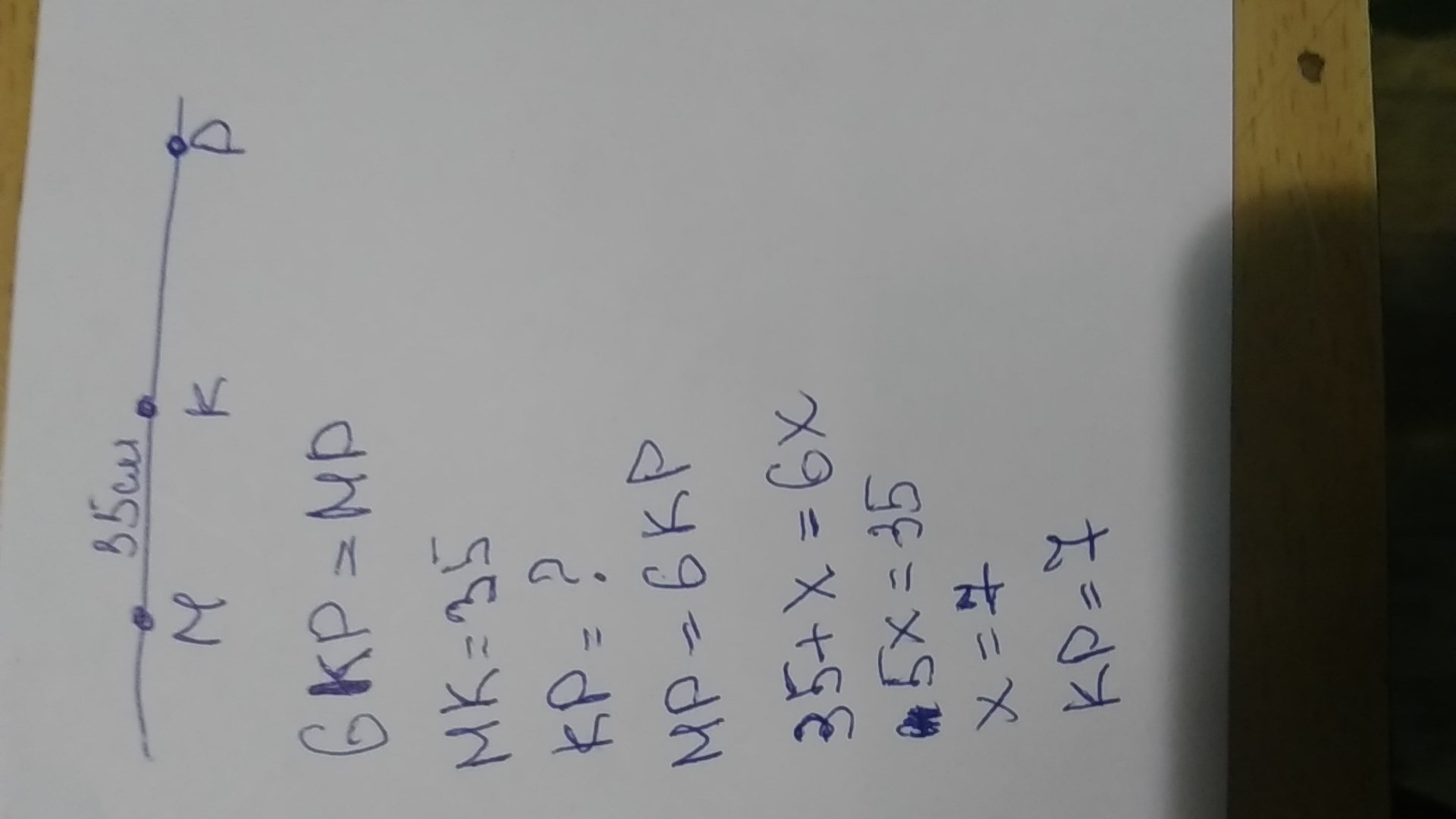 Точки M K P лежат на одной прямой. MK=35 см, отрезок MP в 6 раз больше отрезка KP. Найдите отрезок KP