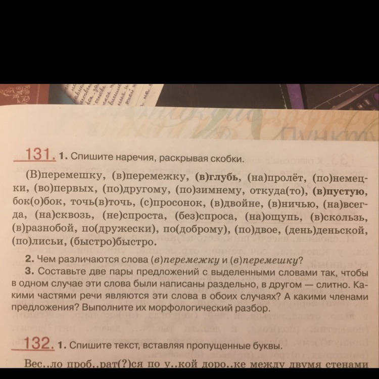 Вперемешку, вперемежку, вглубь, напролёт, по-немецки, во-первых, по-другому, по-зимнему, откуда-то, впустую, бок о бок, точь-в-точь, спросонок, вдвойне, вничью, навсегда, насквозь,, неспроста, без спроса, на ощупь, вскользь, вразнобой, по-дружески, по-доброму, по двое, день-деньской, по-лисьи, быстро-быстро.