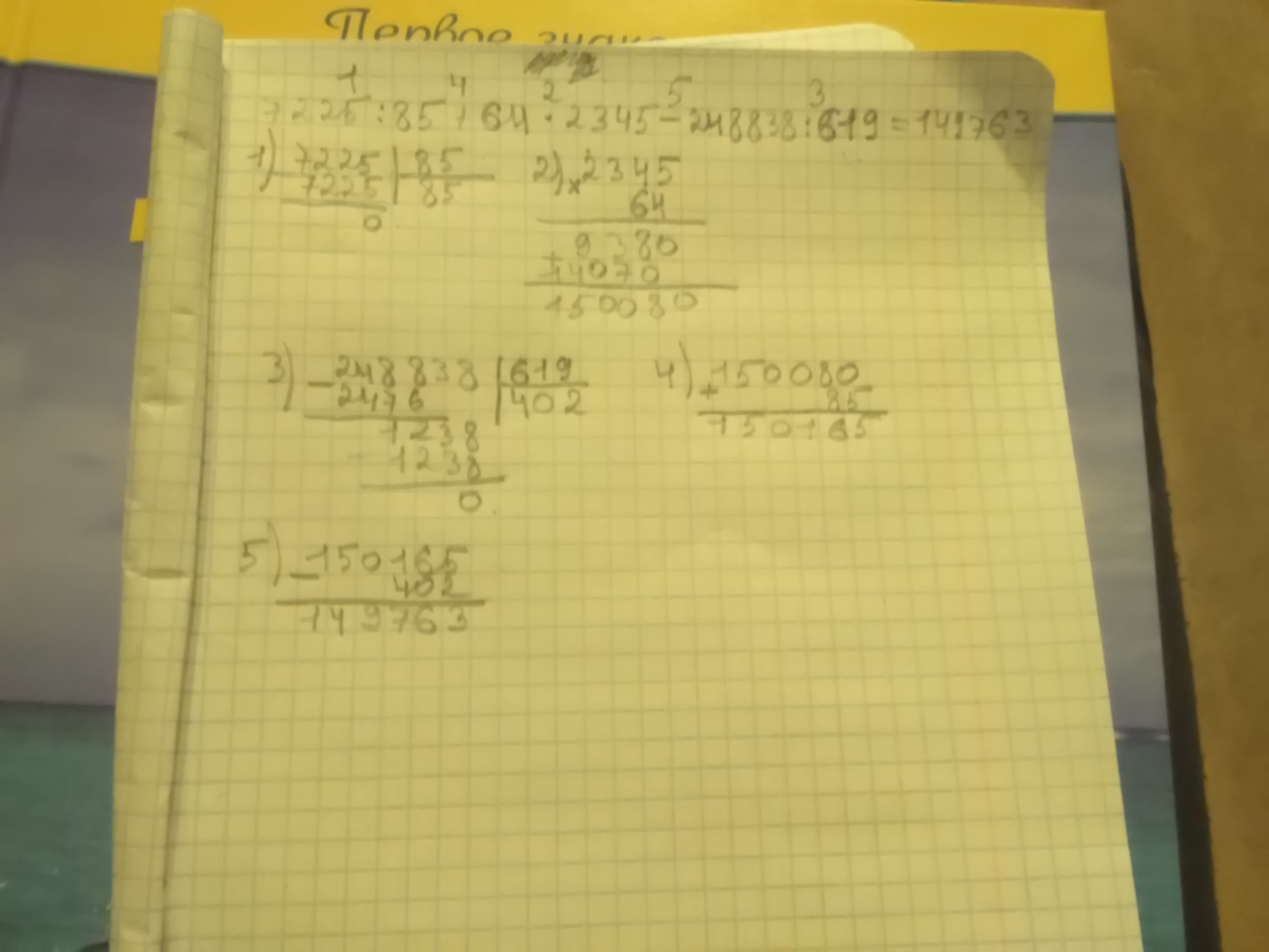 Найдите значение выражения 7225 : 85 + 64 · 2345 − 248838 : 619. Запишите решение и ответ. столбиком