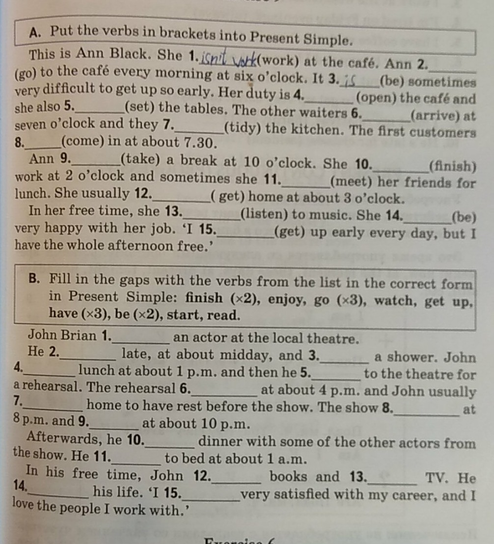 2, Ann goes 3, it is 4,opening the cafe 5 ,sets 6,arrive 7,tidy 8,come 9,takes , 10,finishes 11,meets12,gets13,listens14,is15,get.