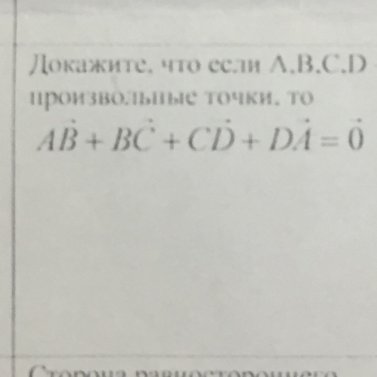 Докажите, что если A.B.C.D произвольные точки, то ABвектор+BCвектор+CDвектор+DAвектор=0