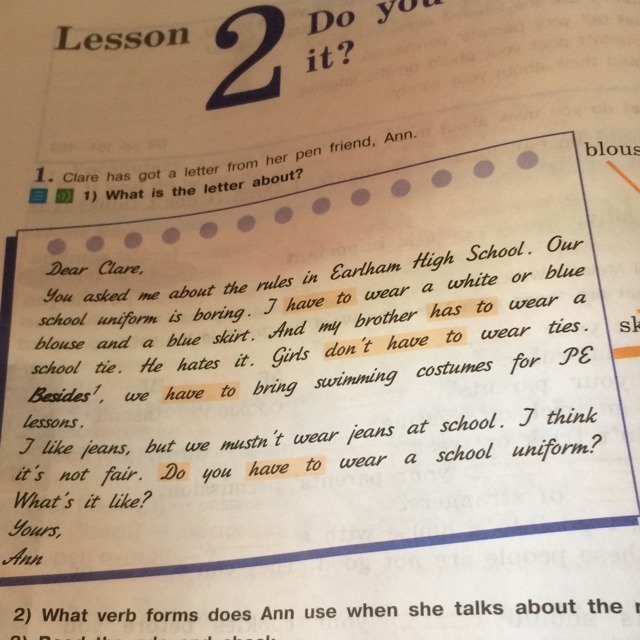 Ты спрашивала меня о правилах в Earlham High School. Наша школьная форма скучная. Я должна носить белую или голубую блузку и синюю юбку. Мой брат должен носить галстук. Он его ненавидит. Девочки не должны носить галстуки.