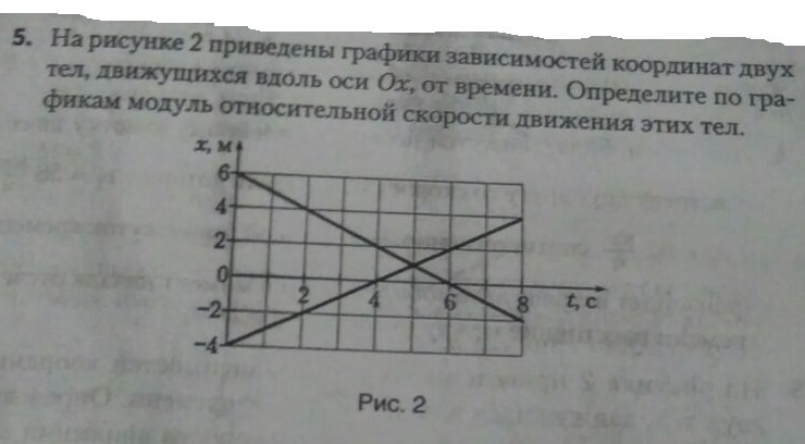 5. На рисунке 2 приведены графики зависимостей координат двух тел, движущихся вдоль оси Ох, от времени. Определите по графикам модуль относительной скорости движения этих тел