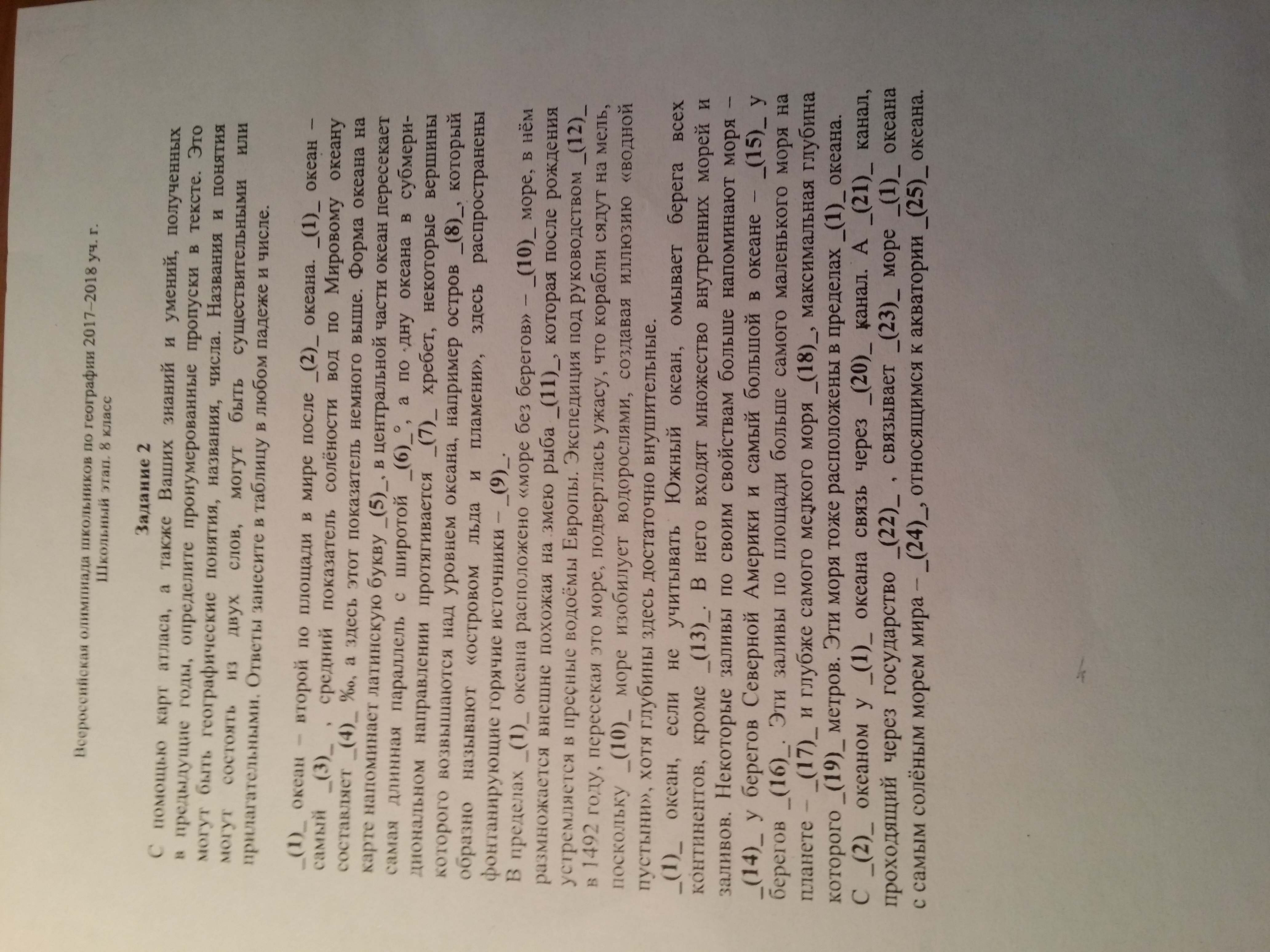 1. Атлантический 2. Тихий 3. ? 4. 35,4 5. S 6. 30 7. Срединно-атлантический 8. Пику 9. гейзеры 10.Саргассово 11. угорь 12. Христофор Колумб 13. Австралия 14. Мексиканский залив 15. Ботнический залив 16. Северная Европа 17. Мраморное 18. Азовское 19. 13,5 20. Панамский 21. Суэцкий 22. Египет 23. Средиземное 24. Красное 25. Индийский.