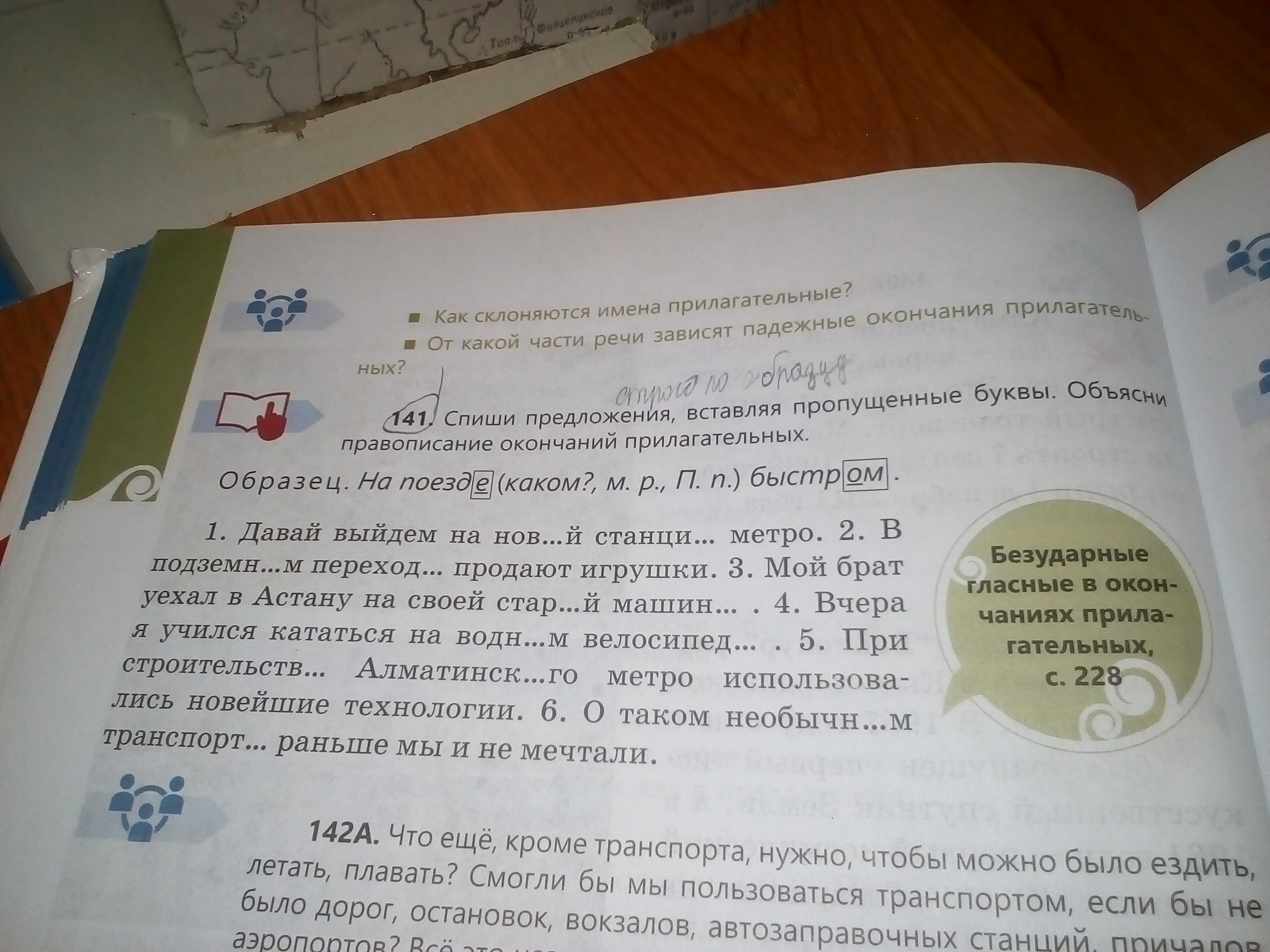 Давай выйдем на новой(какой?,ж.р.;П.п.)станции (ж.р.П.п.)метро.В позднем (каком?,м.р.;П.п.)переходе (м.р.П.п.) продают игрушки.Мой брат уехал в Астану на своей старой (какой?.;ж.р.;П.п.) машине (ж.р.;П.п).Вчера я учился кататься на водном (каком?.;м.р.;П.п) велосипеде (м.р.;П.п.).При строительстве (с.р.;П.п) Алматинского (какого?.;с.р.;П.п.)метро использовались новейшие технологии.О таком необычном (каком?.;м.р.;П.п.)транспорте (м.р.,п.п)раньше мы и не мечтали