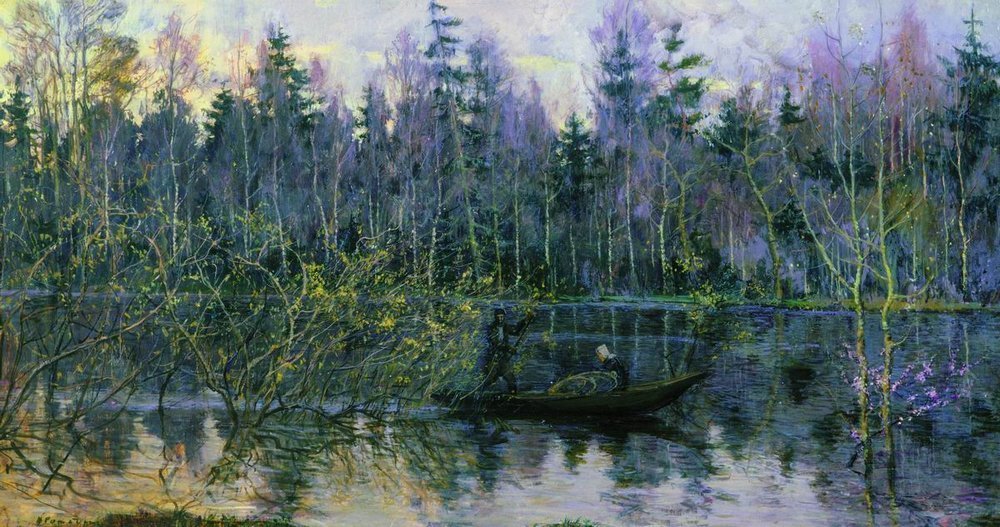 Все это великолепие насыщенных оттенков дрожит, переливается, дробится на цветные мазки водной ряби. Ее потревожила легкая рыбацкая лодка, скользящая от центра полотна по течению. Фигурки рыбаков едва угадываются на фоне леса. Один готовит сеть для ловли, другой работает шестом. Зарождается новый день, неся свои заботы и радости всему живому.