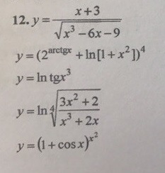 3); ; y=ln, tg(x^3)\\y'= frac{1}{tgx^3} cdot  frac{1}{cos^2x^3} cdot 3x^2\\4); ; y=ln sqrt[4]{ frac{3x^2+2}{x^3+2x} } \\y'= sqrt[4]{ frac{x^3+2x}{3x^2+2x} }cdot frac{1}{4}cdot  Big (frac{3x^2+2}{x^3+2x}Big )^{-frac{3}{4}}cdot  frac{6x(x^3+2x)-(3x^2+2)(3x^2+2)}{(x^3+2x)^2}
