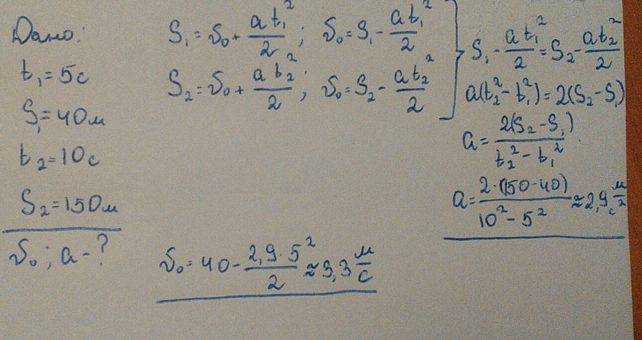 Грузовик, имея некоторую начальную скорость, начал двигаться равноускоренно: за первые 5 с прошел 40 м, а за первые 10 с — 150 м.
