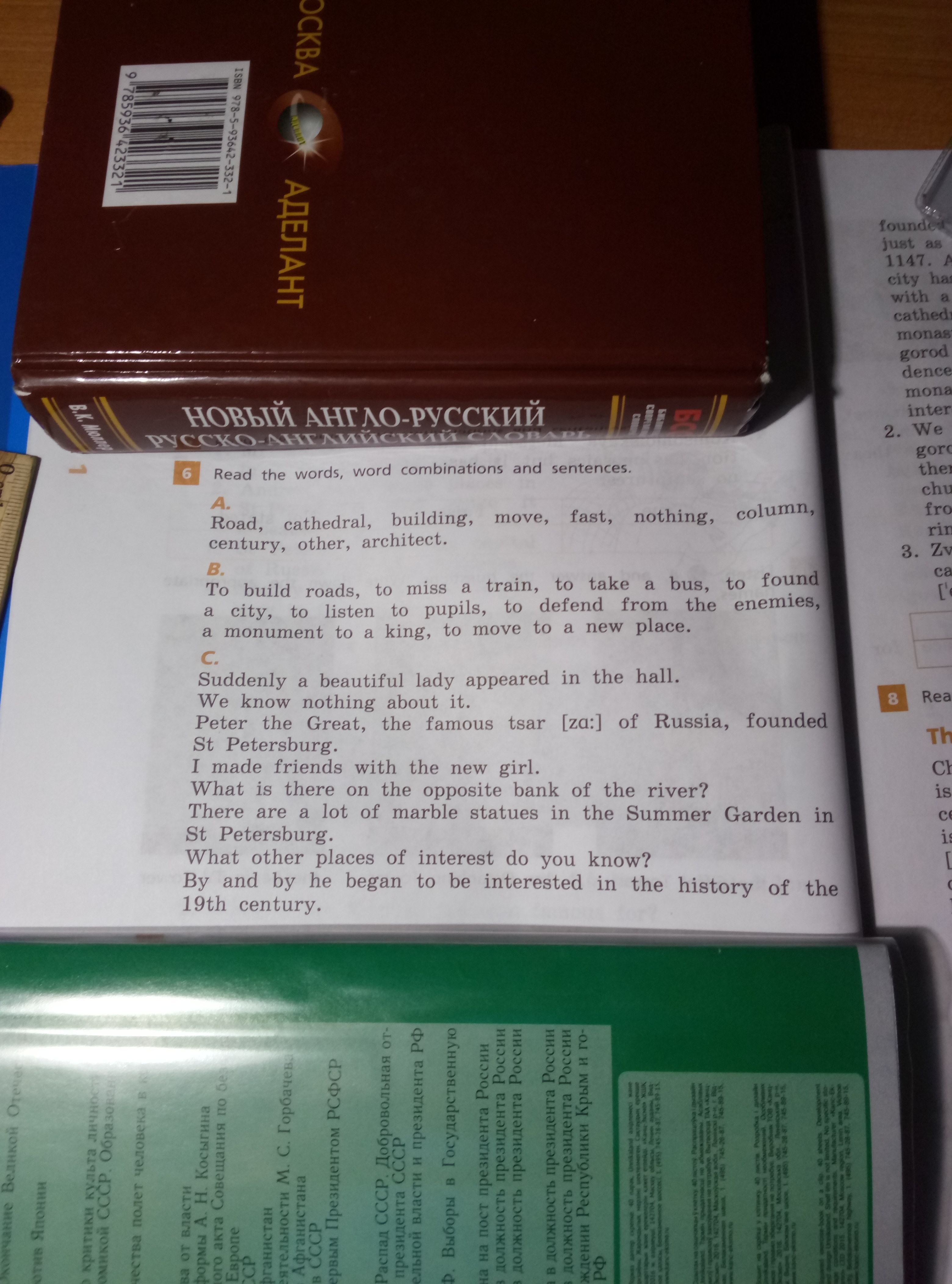 Дорога, собор, строительство, быстро двигаться, ничего, колонна века, архитектор. Чтобы построить дороги, чтобы пропустить поезд, сесть на автобус, найти город, послушать учеников, защитить от врагов памятник королю, перебраться на новое место. Внезапно в зале появилась прекрасная леди. Мы ничего об этом не знаем. Петр Великий, знаменитый царь Лза России, основал Санкт-Петербург. Я подружился с новой девушкой. Что есть на противоположном берегу реки? В Летнем саду в Санкт-Петербурге много мраморных статуй. Какие другие достопримечательности вы знаете? Постепенно он начал интересоваться историей XIX века.