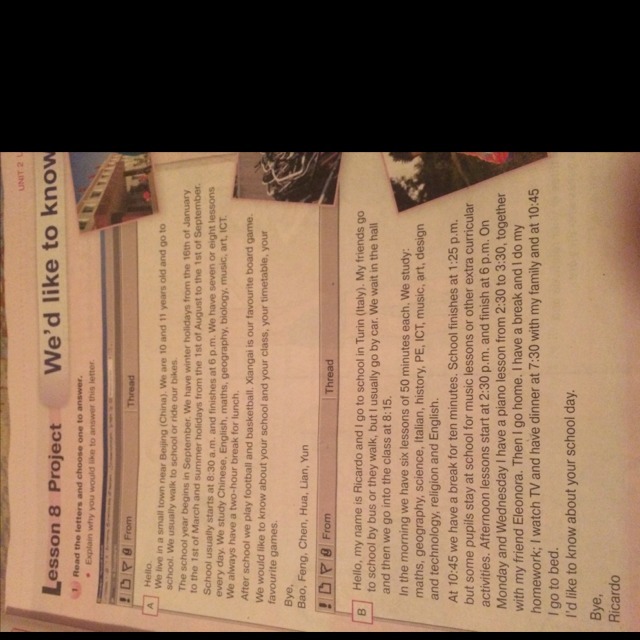 Привет, меня зовут Рикардо и я ходу в школу в Турине ( Италия ). Мои друзья ездят в школу на автобусе или идут пешком, но чаще они едут на машине. Мы ждём в холле и затем мы заходим в класс в 8:15.