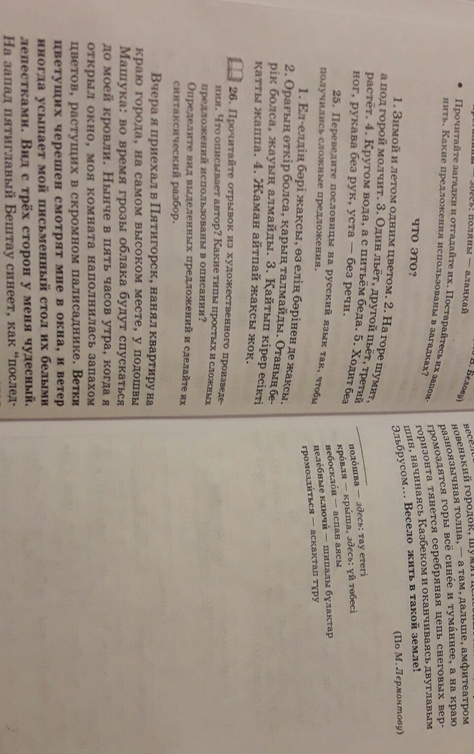 1) Ветки(подлежащее) цветущих(определение) черешен(дополнение) смотрят(сказуемое) мне(дополнение) в окна(обстоятельство),и(союз) ветер(подлежащее) иногда(обстоятельство) усыпает(сказуемое) мой(определение) письменный(определение) стол(дополнение) их(определение) белыми(определение) лепестками(дополнение).Это повест.,невоскл. сложное предложение,состоящее из двух простых двусоставных распространённых предложений.2) Вид(подлежащее) с трёх сторон(обстоятельство) у меня(дополнение) чудесный(определение).Это повест.,невоскл. простое односоставное распространённое предложение.3) Весело(обстоятельство) жить(сказуемое) в такой(определение) земле(обстоятельство)!Это воскл. простое односоставное распространённое предложение.