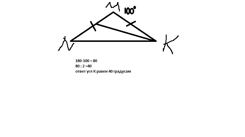 Постройте треугольник KNM, у которого один угол M = 100° , KM = MN = 32мм. Измерьте угол K и проведите его биссектрису.