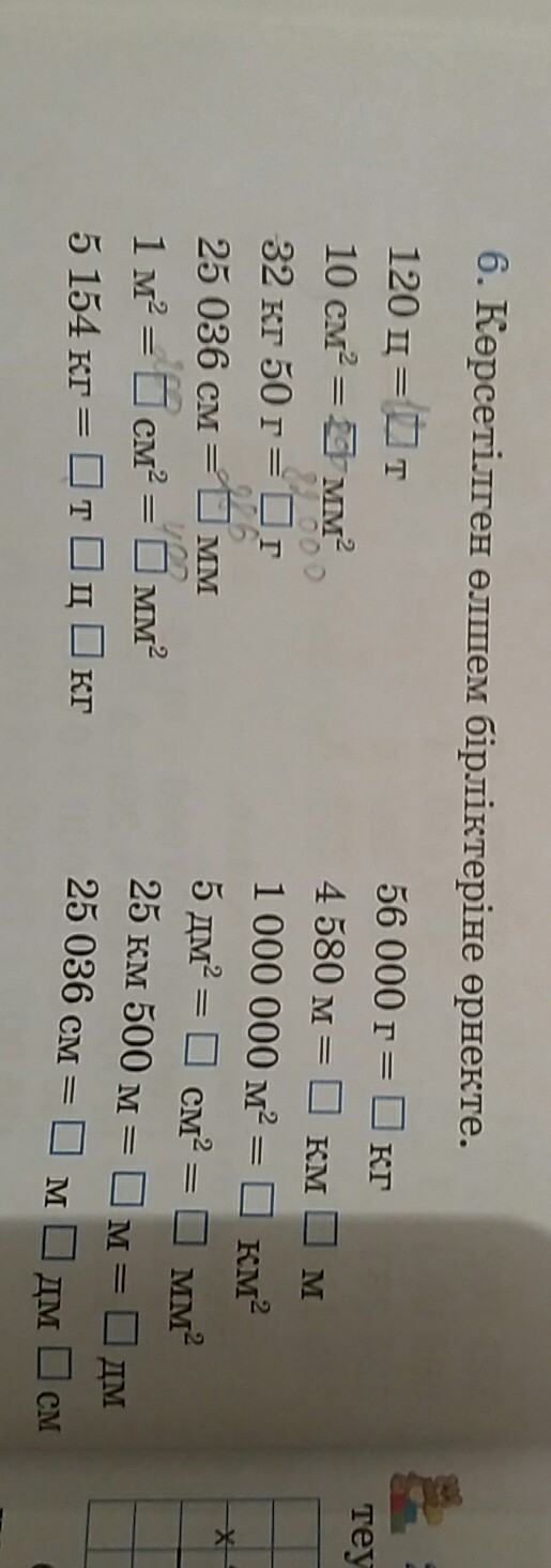 120ц=12т 10см2=1000мм2 32кг50г=32500г 25036см=250360мм 1м2=10000см2=1000000мм2 5154кг=1т1ц54кг