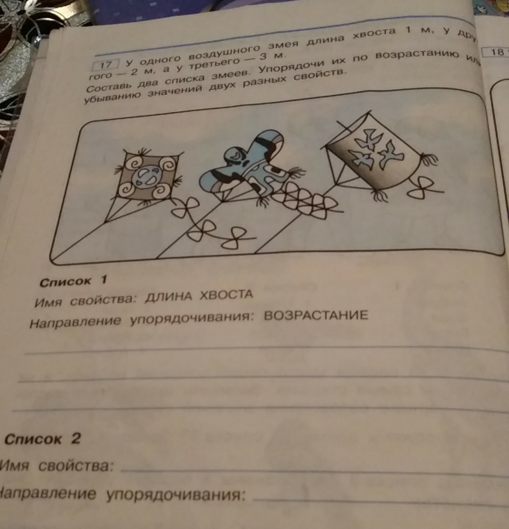 у одного воздушного змея длина хвоста 1м, у другого-2м, а у третьего-3м. составь два списка змеев. упорядочи их по возрастанию или убыванию значений двух разных свойств.