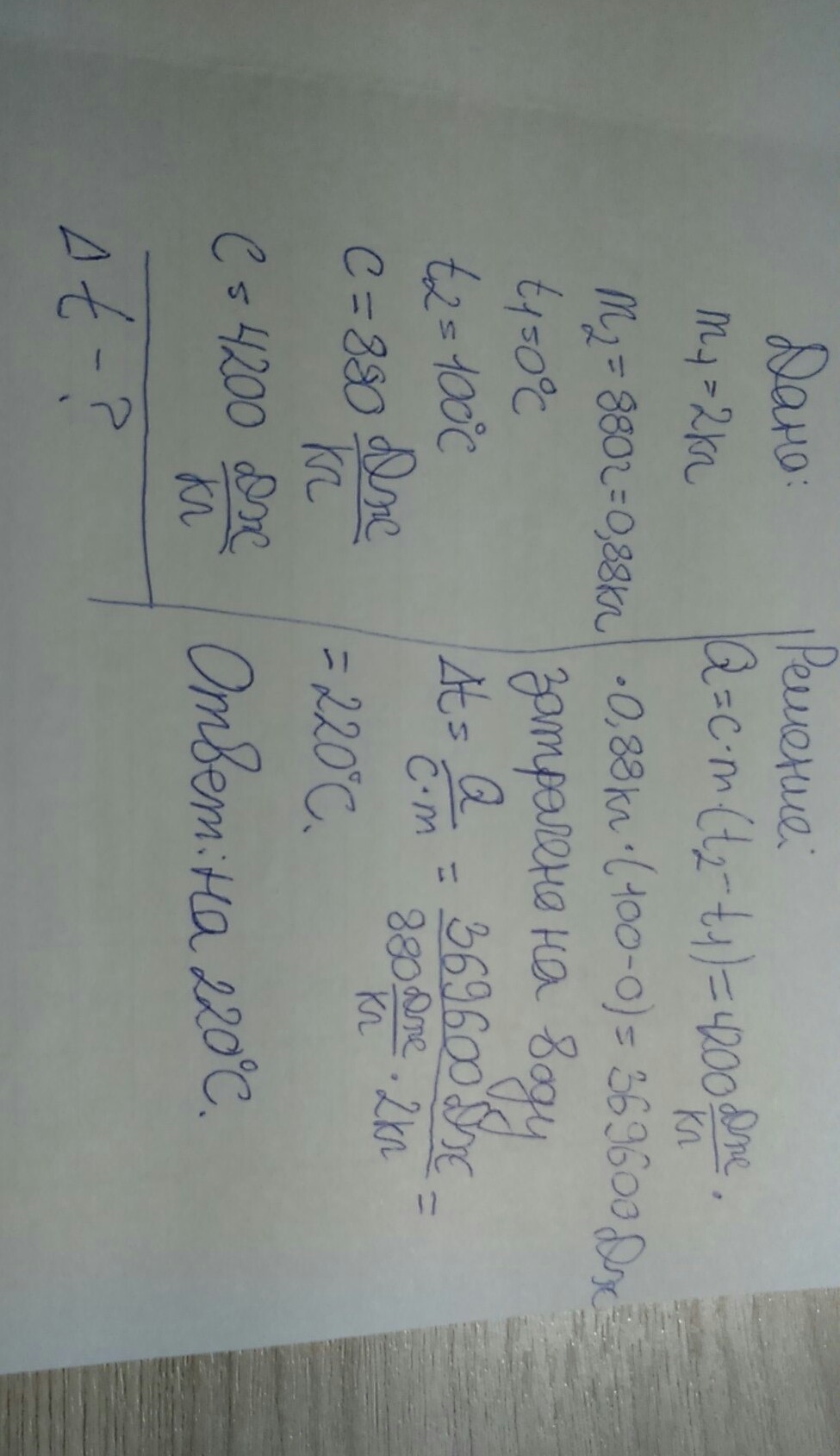 На сколько измениться температура алюминиевой заготовки массой 2 кг,если ей придать такое же кол-во теплоты,что идет на нагревание воды массой 880г о 0°С до 100°С? (С алюминия=880 Дж/кг*K, c=4200Дж/кг*К) СРОЧНО!