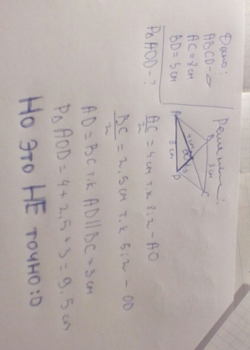 . В параллелограмме ABCD диагонали равны 8 см и 5 см, сторона ВС равна 3 см, О- точка пересечения диагоналей. Чему равен периметр треугольника AOD?