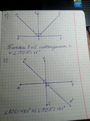 Так как в условии задачи недостаточно данных о расположении точек, задача имеет бесконечно много решений(∠MON ∈ [0°;180°]). Вот пример двух из них: