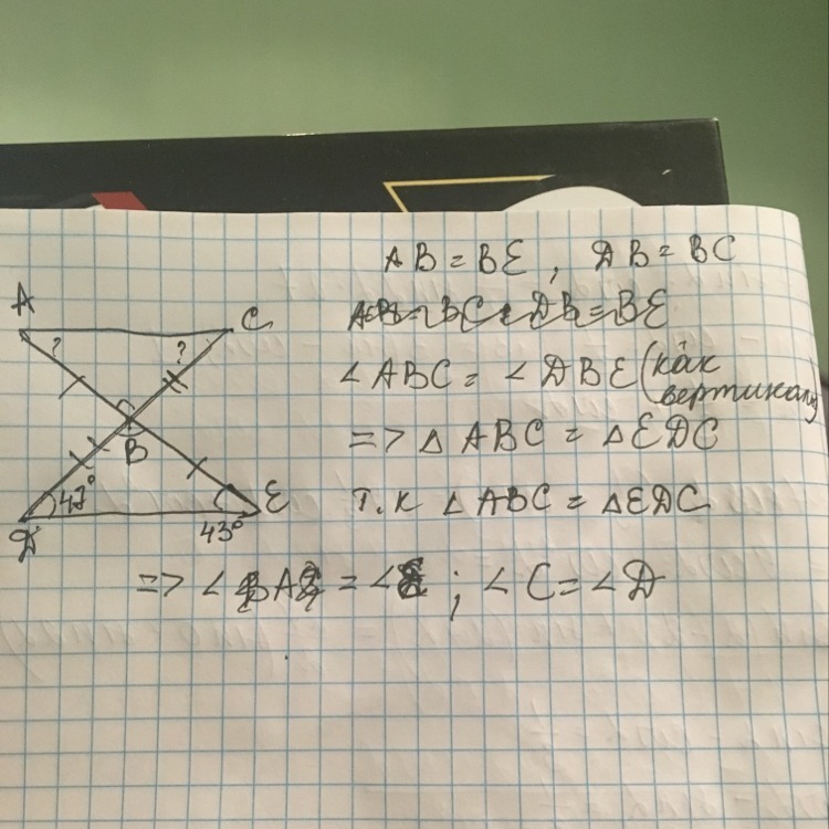 Отрезки АЕ и DС пересекаются в точке В, являющейся серединой каждого из них. а) Докажите, что треугольники АВС и ЕDС равны. б) найдите углы А и С треугольника АВС, если в треугольнике ВDЕ D=47° , Е=43°