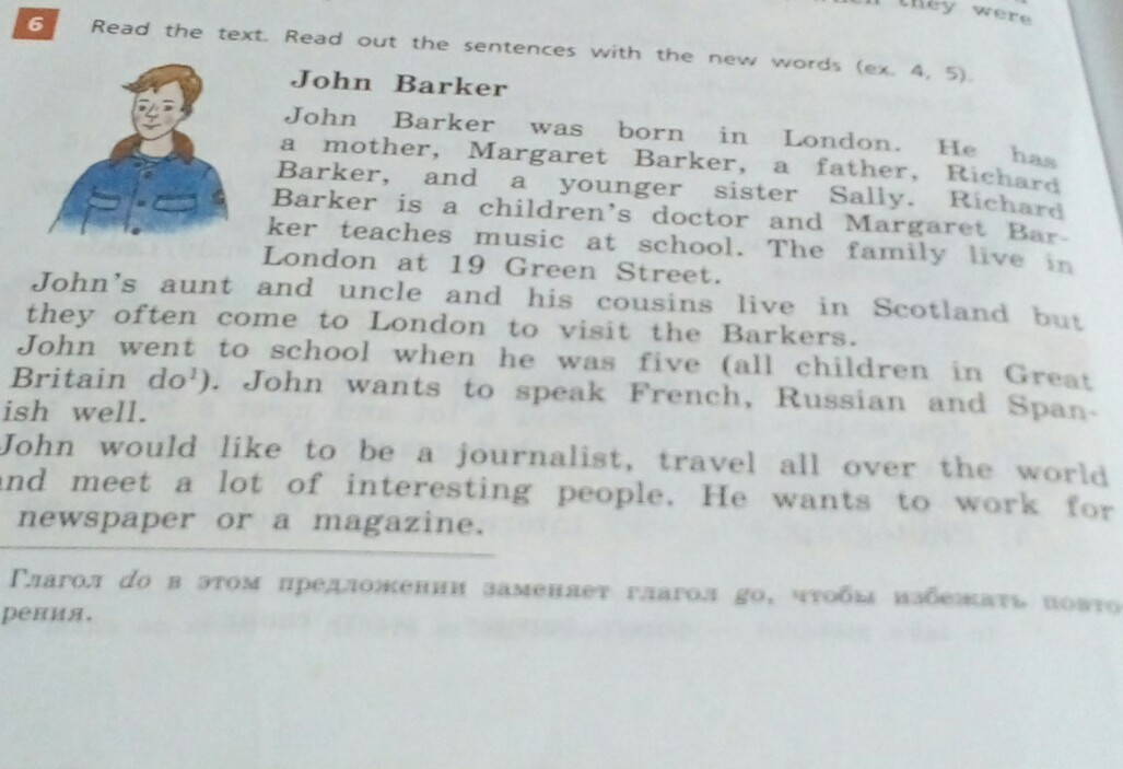 Баркер Джон Баркер родился в Лондоне. Его мать, Маргарет Баркер, отец Ричард Баркер, и младшая сестра Салли Ричард Баркер - детский доктор, а Маргарет Бар Кер учит музыке в школе. Семья живет в Лондоне по адресу 19 Green Street. Тетя и дядя Иоанна и его двоюродные братья живут в Шотландии, но они часто приезжают в Лондон, чтобы посетить Баркерс. Джон пошел в школу, когда ему было пять лет (все дети в Великобритании делают Джон хочет хорошо говорить на французском, русском и испанском языках. Джон хотел бы быть журналистом, путешествовать по всему миру и встречаться с множеством интересных людей. работать в газетах или журналах.