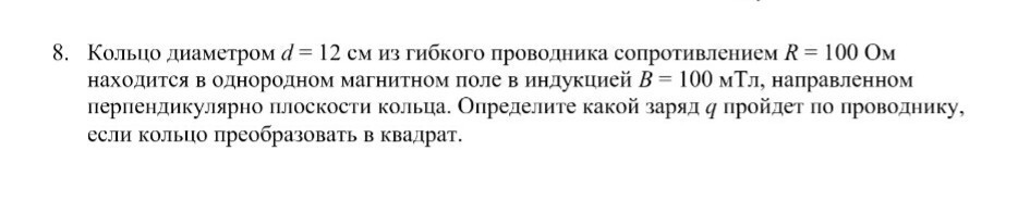 ЭДС индукции, возникающая в проводнике при изменении площади, ограниченной контуром E=BΔS/Δt, а возникающий в нем ток I=E/R=BΔS/(Δt·R). Т. к. сила тока I=Δq/Δt, то приравнивая правые части последних 2-х равенств, получим: Δq/Δt=BΔS/(Δt·R), откуда Δq=BΔS/R=Bπ·D²(4-π)/(16R)