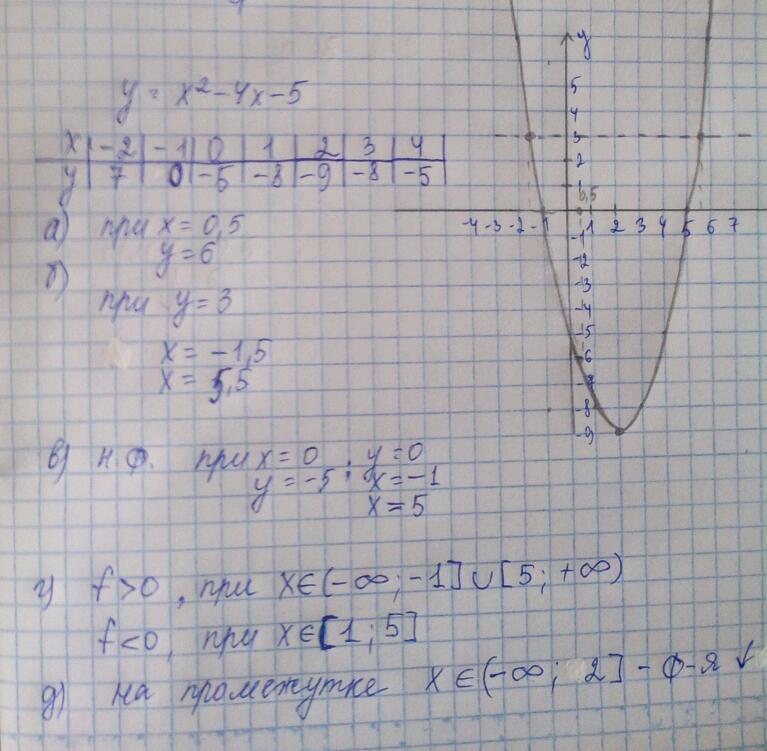 Постройте график функции y=x^2-6х+5.Найдите с помощью графика а) значение y при x=0,5 б) значения x, при которых y=-1 в) Нули функции, промежутки, в которых y>0 и в которых y<0 г) промежуток, в котором функция возрастает