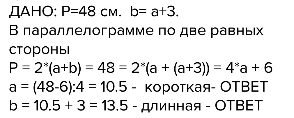 Периметр параллелограмма равен 48 см. Найдите стороны параллелограмма , если одна сторона на 3 см больше другой