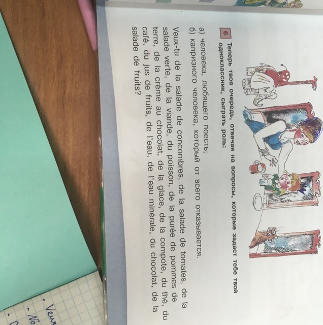 Хочешь ли ты салат из огурцов, томатный салат, салат из зелени, мясо, рыбу, картофельное пюре, шоколадный крем, мороженое, компот, чай, кофе , фруктовый сок, воду, минеральную воду, шоколад, фруктовый салат