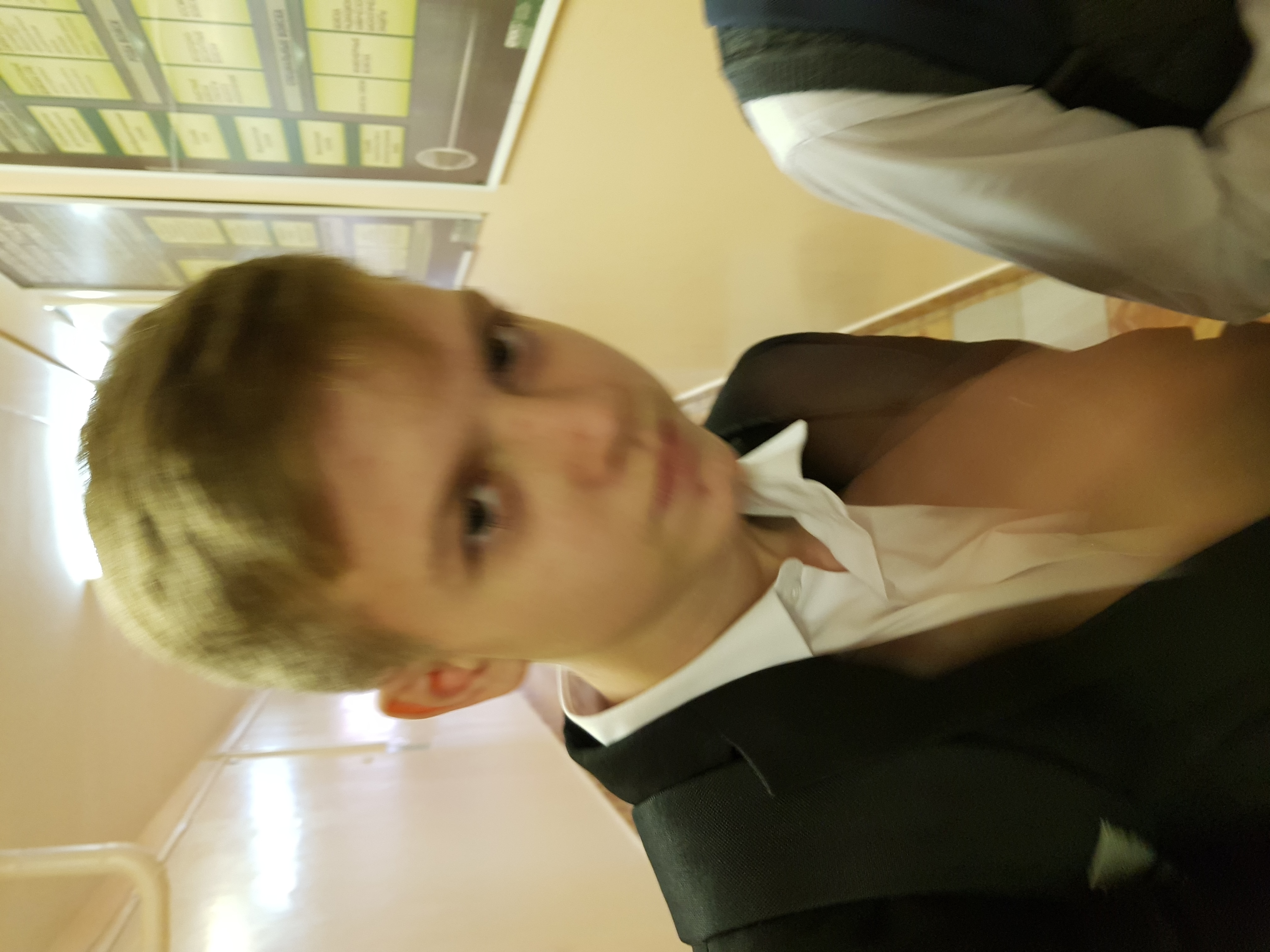 Он выглядит нервно.На кого то смотрит.У него волосы длинные нужно подстричь.Красивый мальчик в черном костюмчике.И белой рубашкой.