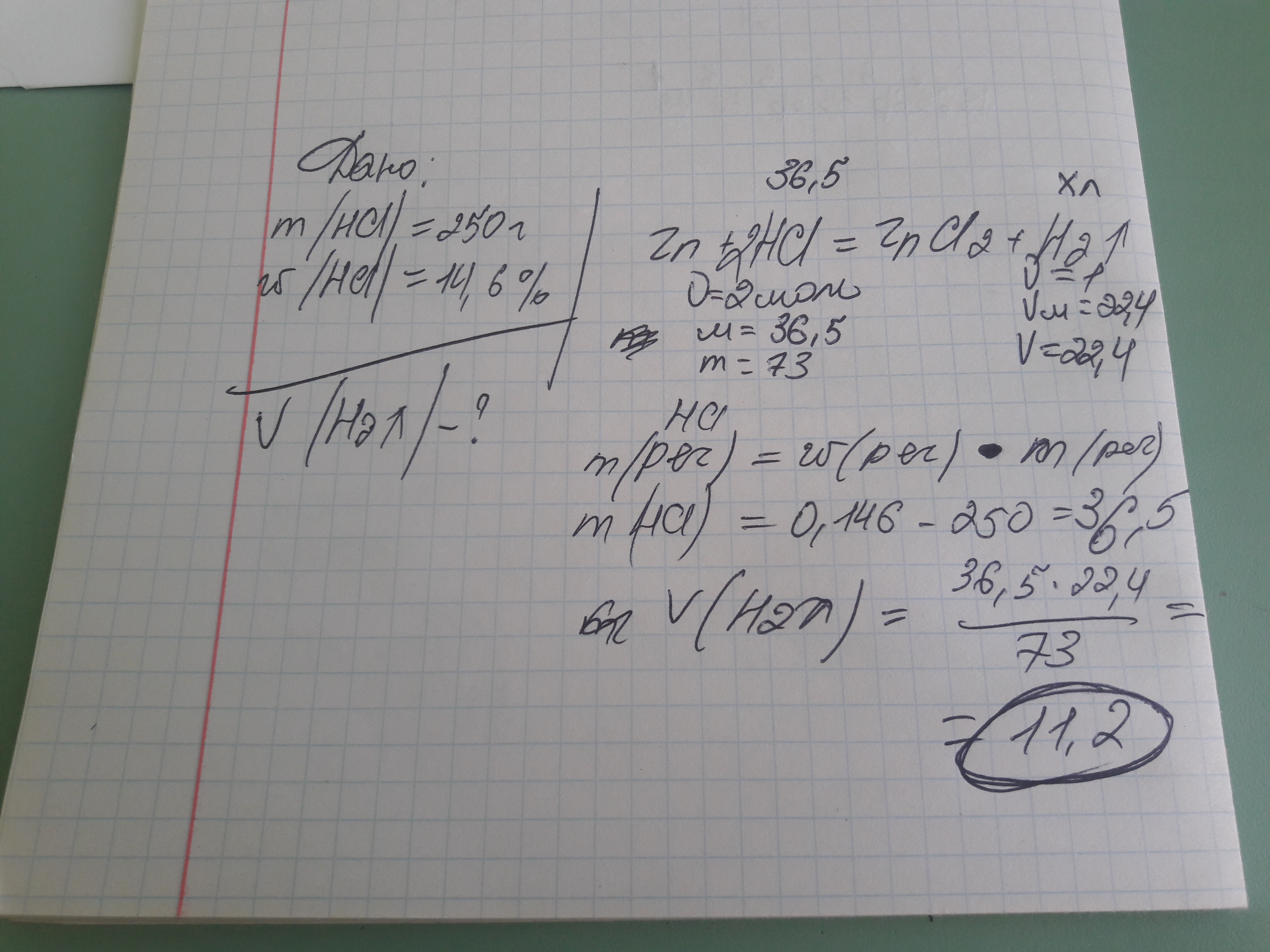 какой обьем водорода (н.у.) выделится при взаимодействии избытка цинка с 250г раствора соляной кислоты с массовой долей 14,6% ?