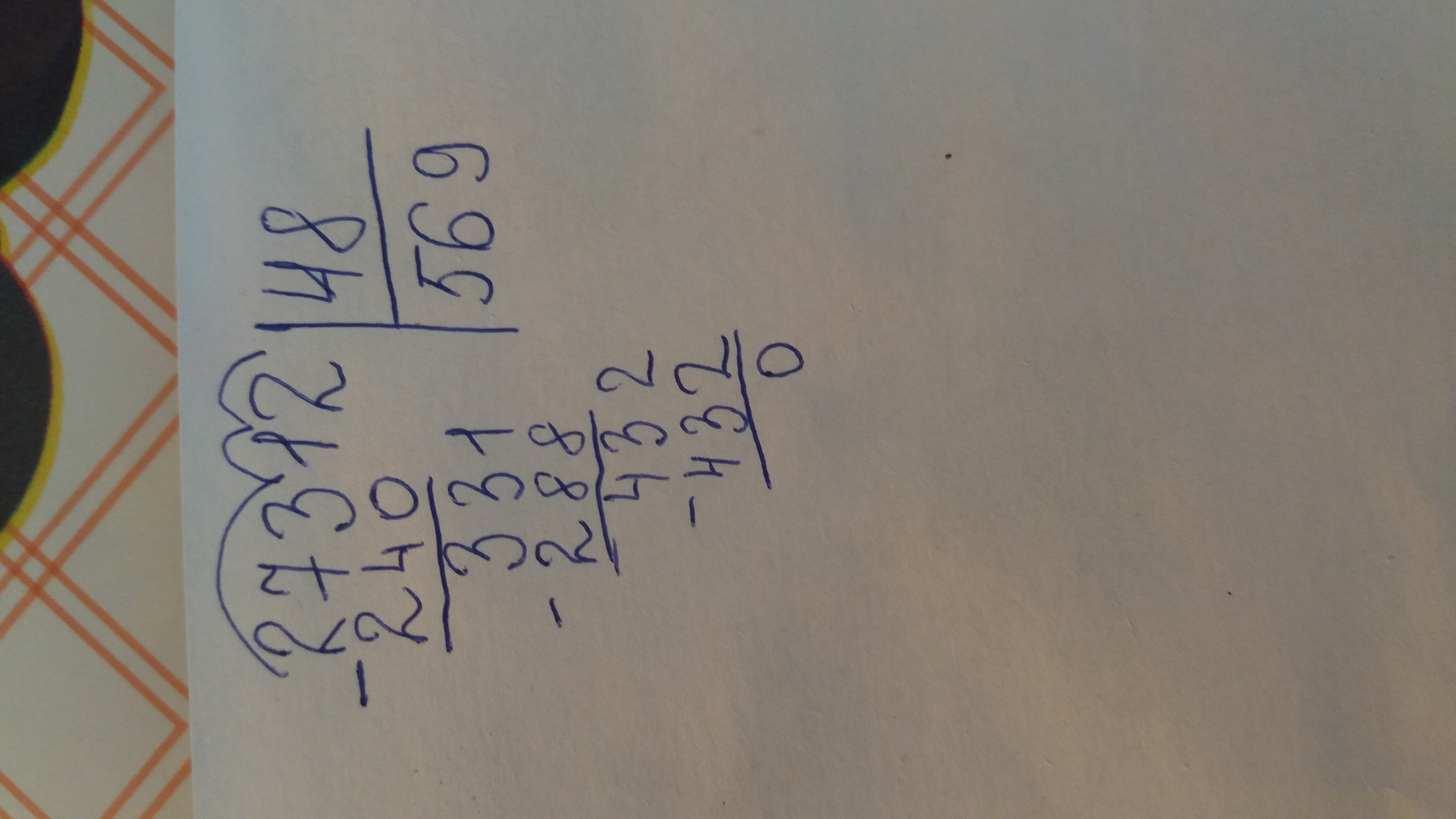 ответ 569 делишь 27 на 48 не делится затем берёшь 273 делится 5 умножаешь на 48 скоко получается отнимаешь от 273 разность записываешь смотришь делитс ли на 48 елси деллится то делишь если нет то берёшь следущее чилсо 1 если сново не делится берёшь следущее число 2