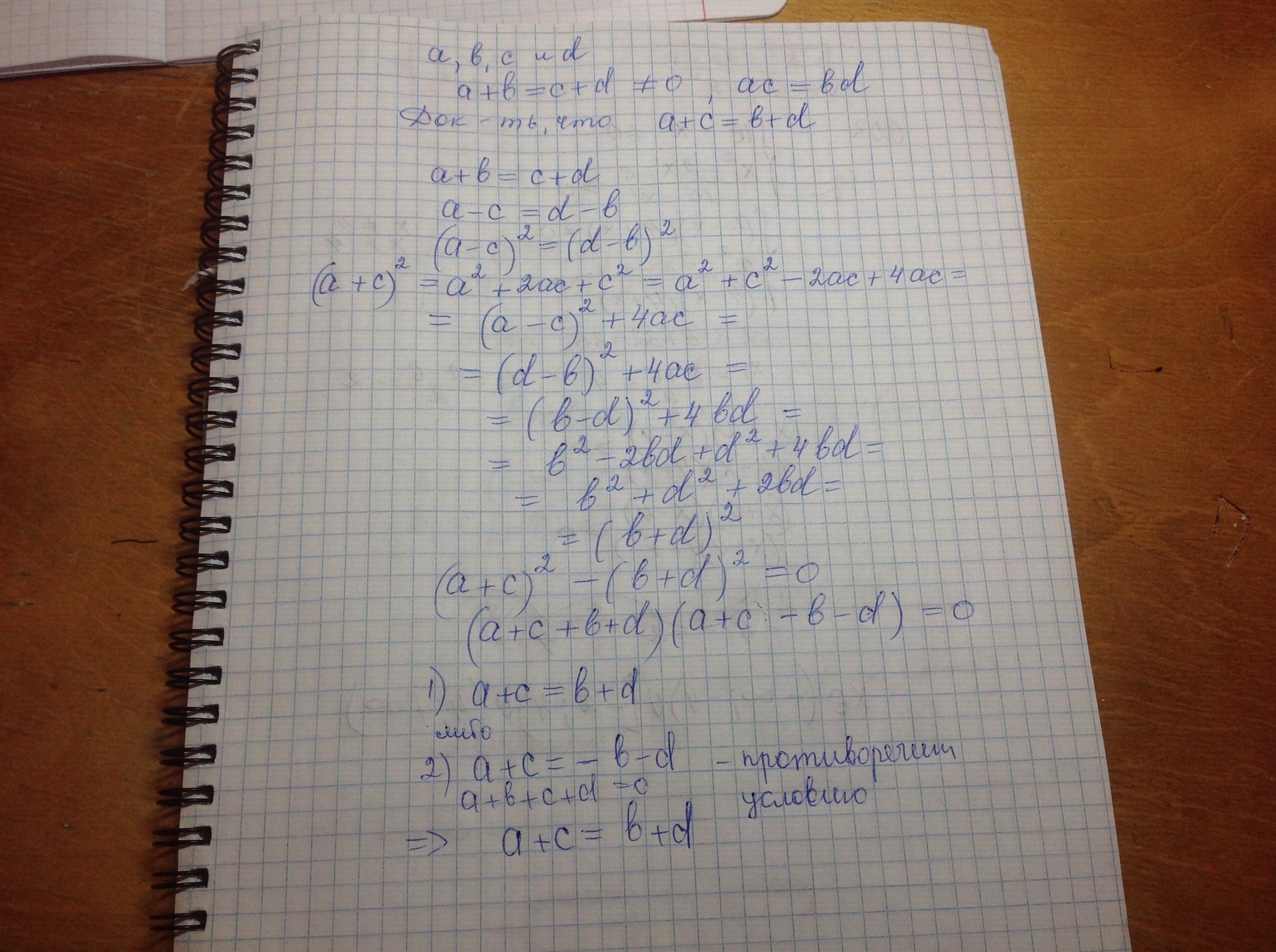 Число a,b,c и d таковы, что a+b=c+d не равно 0, ac=bd . Докажите , что a + c = d + b.