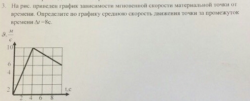 На рисунке 1 приведен график зависимости мгновенной скорости материальной точки от времени. Определите среднюю скорость движения точки за промежуток времени дельтаt=8 секунд