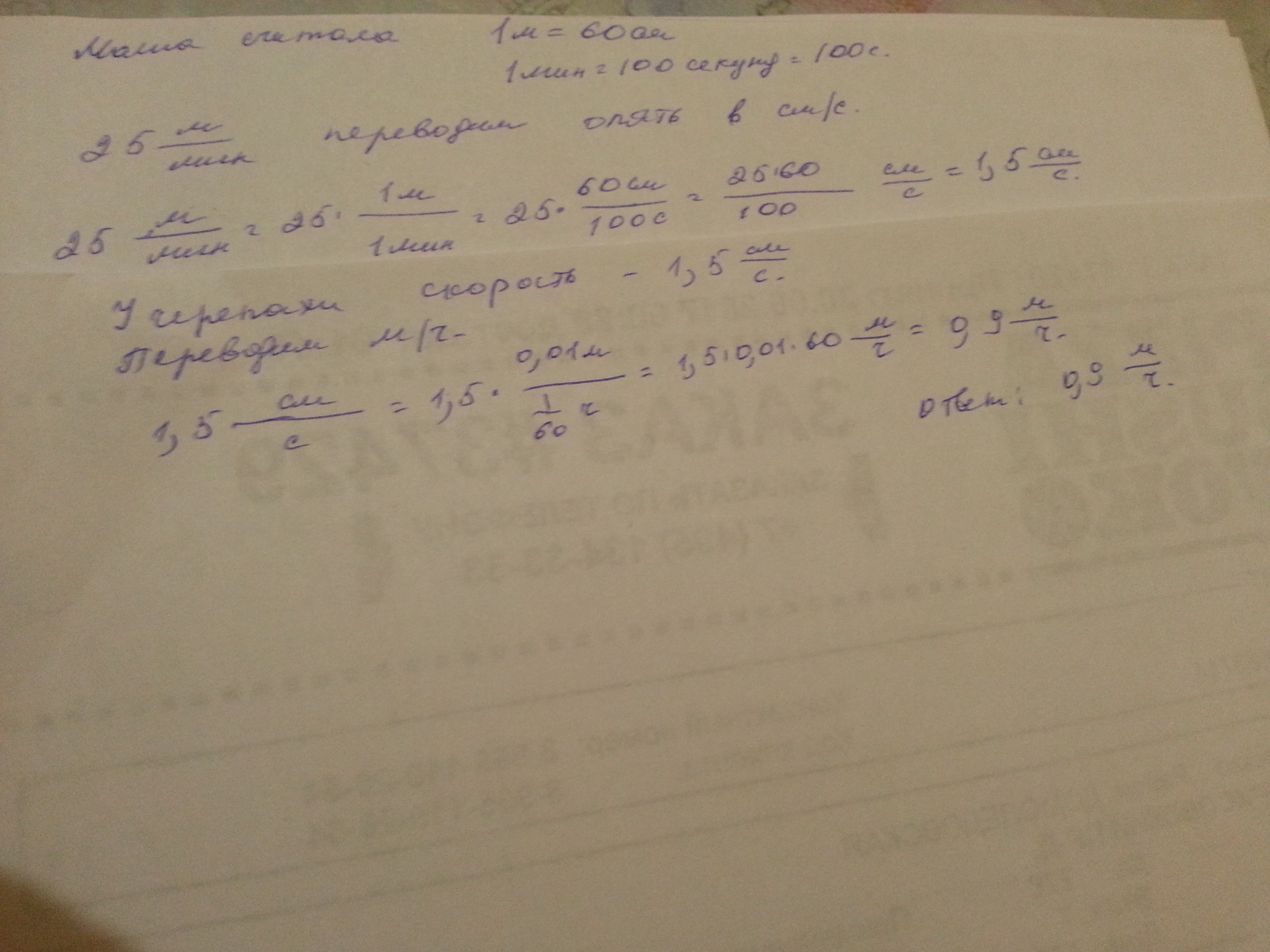 Ребятам дали задание перевести скорость черепахи из сантиметров в секунду в метры в минуту. Маша получила 25 метров в минуту, но при этом считала, что в метре 60 см, а в минуте 100 секунд. Помогите найти Маше найти правильный ответ! Умоляю, решите! СРОЧНО!