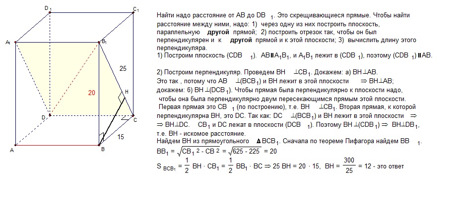 сторона основания правильной четырехугольной призмы равна 15 см, диагональ его боковой грани - 25см. найдите кратчайшее расстояние от стороны основания до не пересекающей ее диагонали призмы