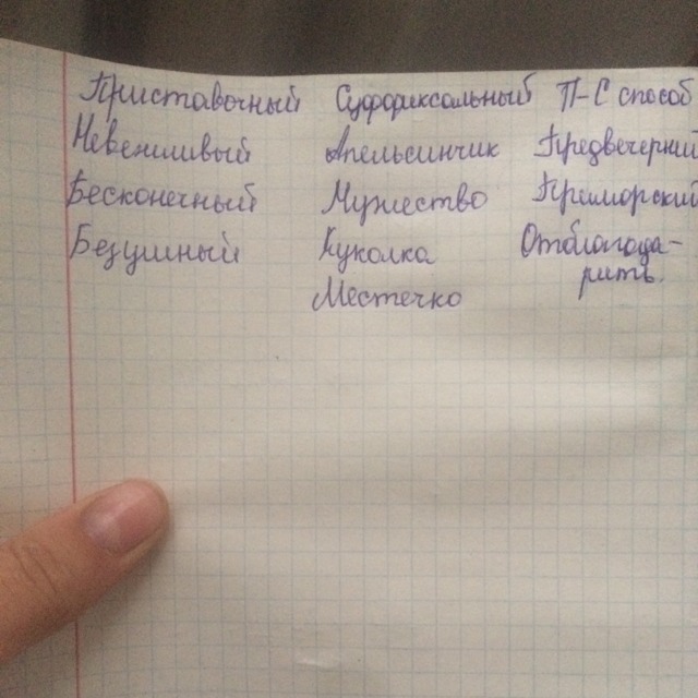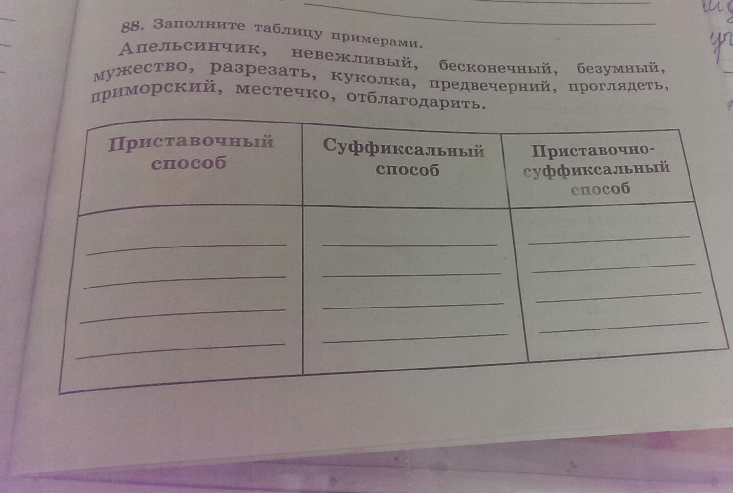 апельсин суффиксальный, невежливый тоже суффиксальный,бесконечный приставочно суффиксальный, безумный приставочно суффиксальный,мужество суффиксальный, разрезать приставочно суффиксальный, куколка суффиксальный, предвечерний приставочно суффиксальный,проглядеть приставочно суффиксальный, приморский приставочно суффиксальный, местечко суффиксальный,отблагодарить приставочно суффиксальный.