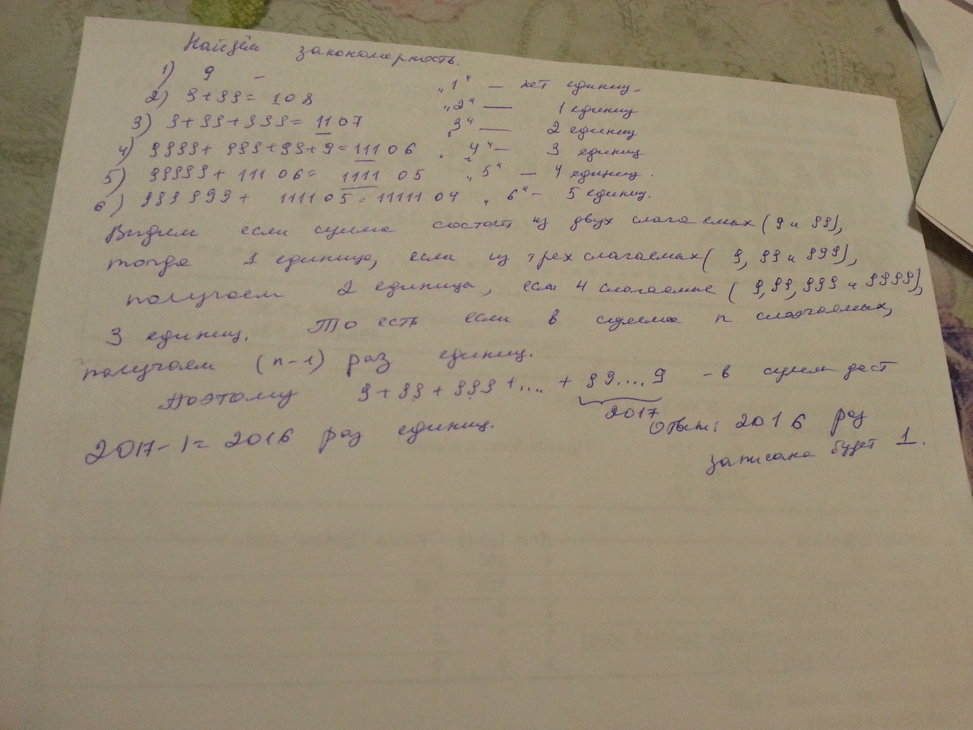 Леша не поленился вычислить сумму 9+99+999+...+9...9(2017) и выписать ее на доску .Сколько раз в итоговом результате записана цифра 1? ПОМОГИТЕ ПОЖАЛУЙСТА!!!!!!!!!!! СРОЧНО!!!!!!