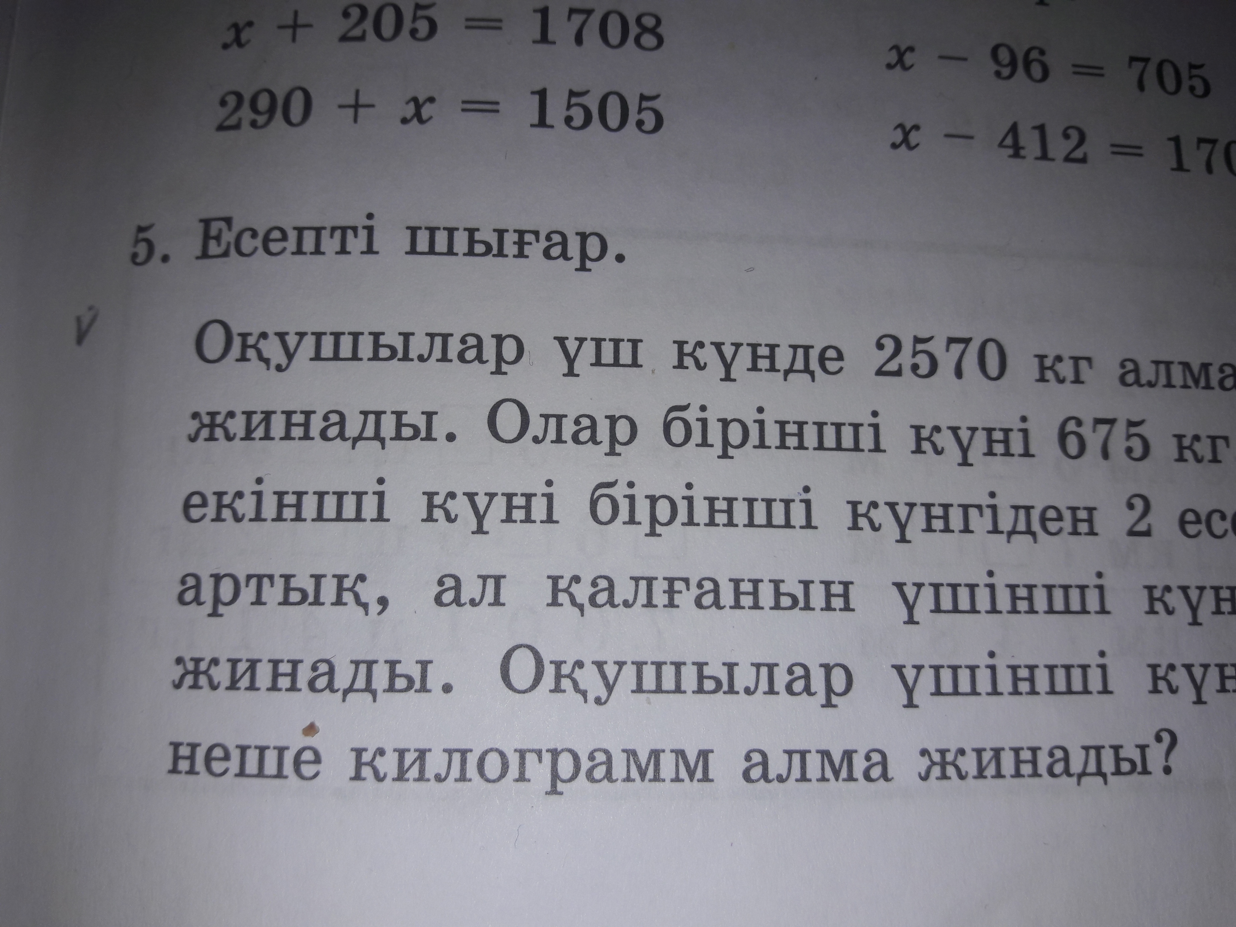 Окушылар уш кунде 2570 кг алма жинады. Олар биринши куни 675 кг, екинши куни биринши кунгиден 2 есе артык, ал калганын ушинши куни жинады. Окушылар ушинши куни неше килограмм алма жинады?