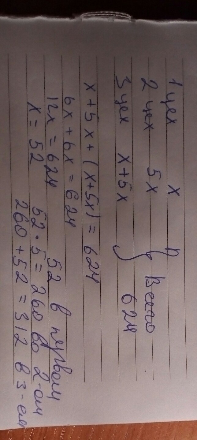 На заводе в трех цехах работают 624 рабочих. Во втором цехе рабочих в 5 раз больше,чем в первом,а в третьем столько в первом и во втором вместе. Сколько рабочих в каждом из цехов. (Решение с помощью уравнения)
