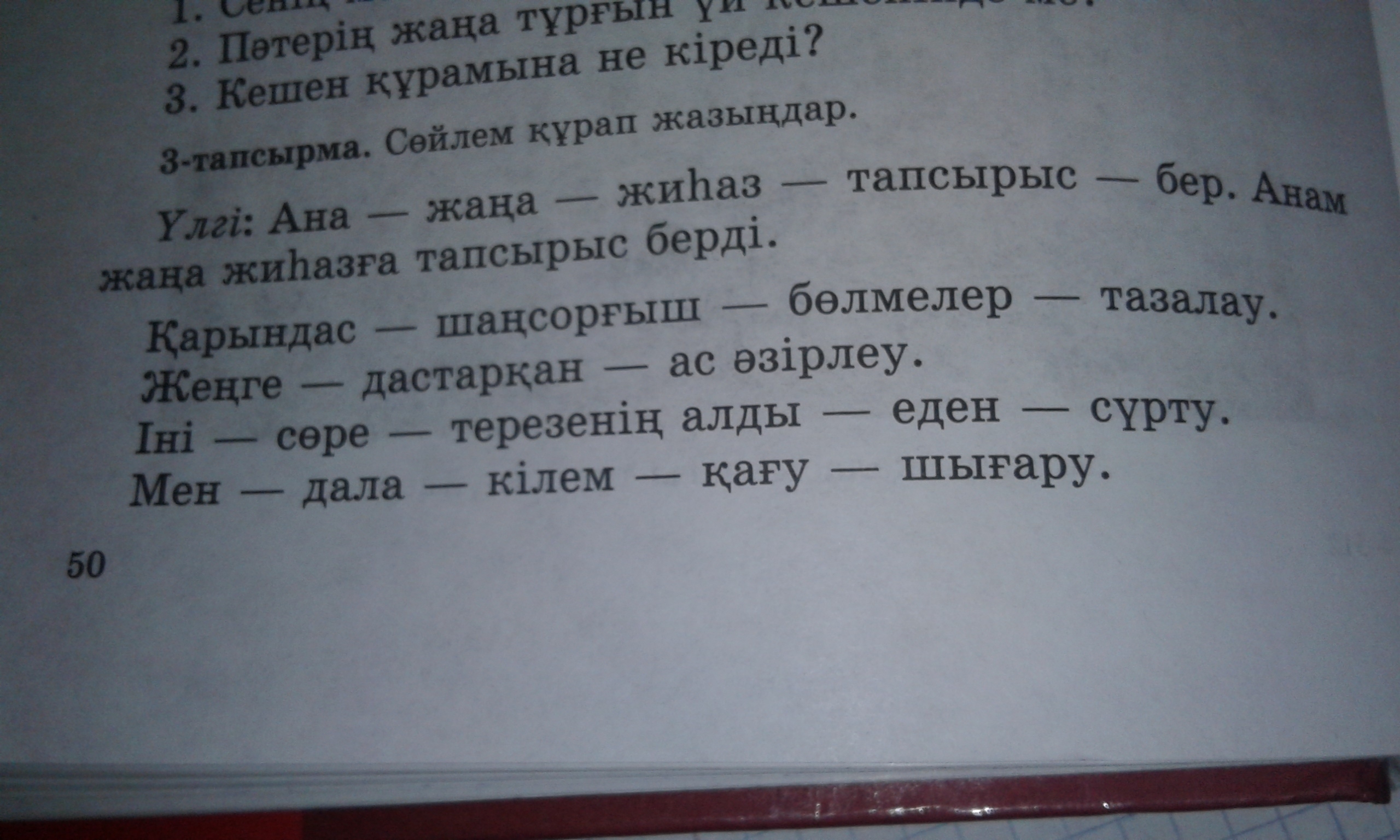 Қарындасым щаңсорғышпен бөлмелерді тазалады.Жеңгем дастарқанға ас əзірлеуде.Інім сөрені,еденді,терезенің алдын сүртті.Мен далаға кілемді қағуға шығардым.
