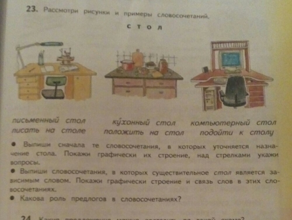 1. Словосочетания: Писать на (чём?) На столе, стол (какой?) Письменный. 2. Словосочетания: стол (какой?) Кухонный, положить(на что?) На стол. 3 словосочетания: стол(какой?) Компьютерный,подойти к (чему?) К столу