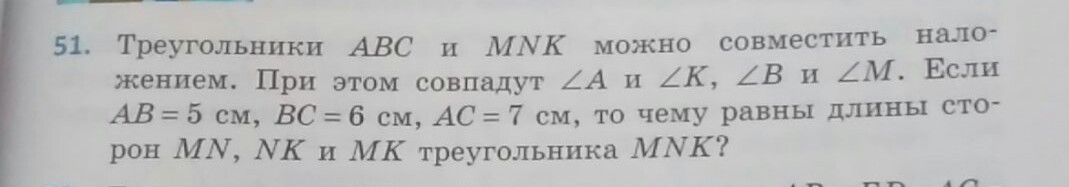 1)По условию задачи ∆АБС=∆МНК.Значит АБ=МН,БС=НК,АС=МК. Или напиши,что если три стороны одного треугольника равны соответственно трём сторонам другого треугольника,то такие треугольники равны(это признак равенства треугольников)