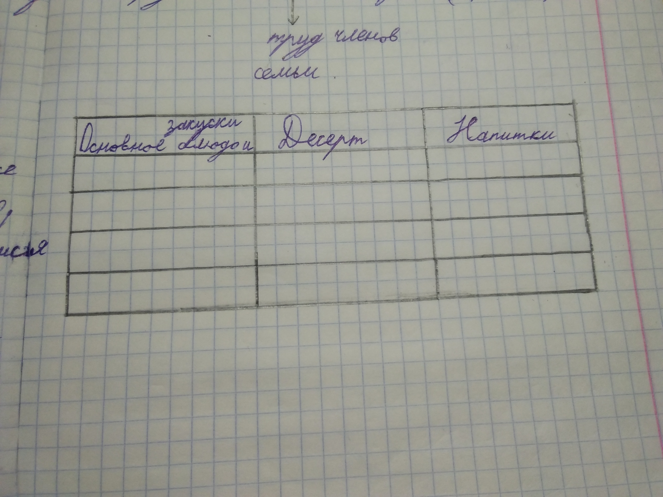Основное блюдо - мясо,пицца,картошка,салат. Десерт - торт,мороженое,пирог,желе. Напитки - вода,компот,сок,кола.