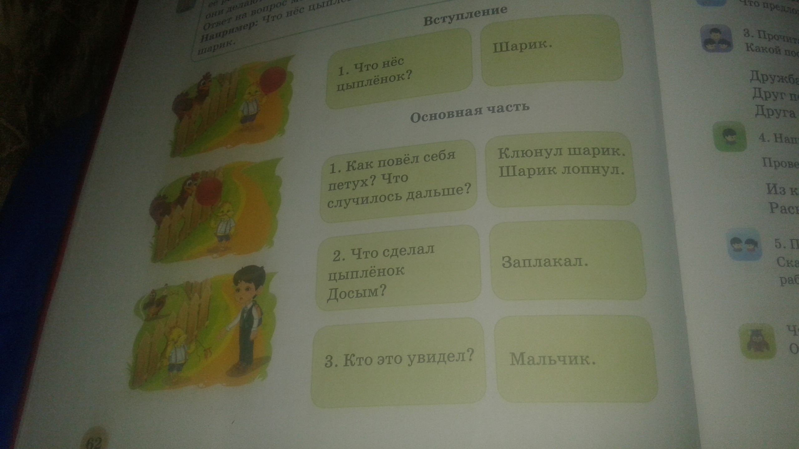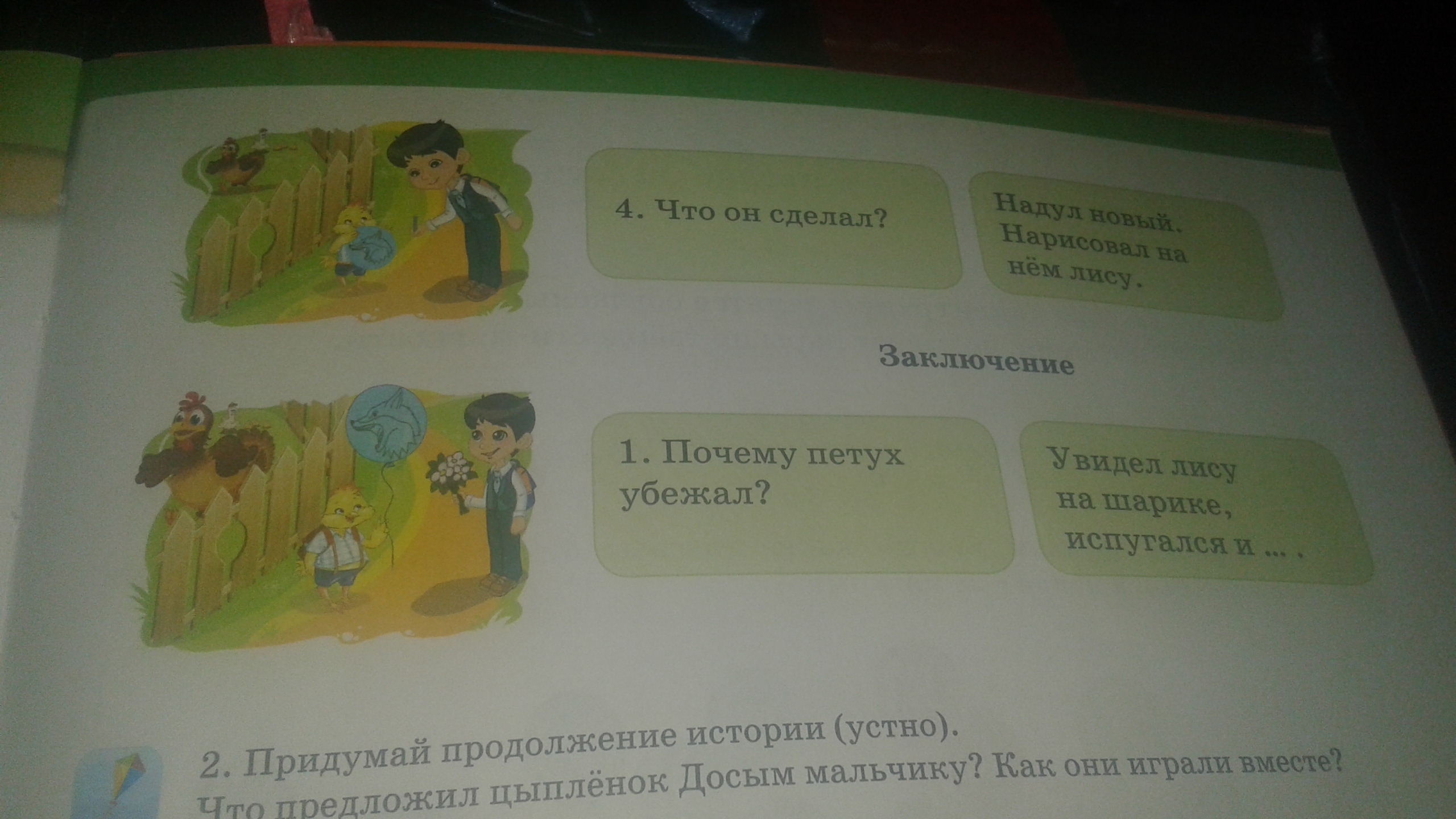 Цыплёнок нёс воздушный шарик. Из-за забора показался петух, и клюнул его. Шарик тотчас лопнул. Цыплёнок горько заплакал, но тут его увидел мальчик. Он захотел помочь ему, надул новый шарик, и нарисовал на нём лису. Цыплёнок обрадовался. А петух увидев лису на шарике испугался, и убежал.