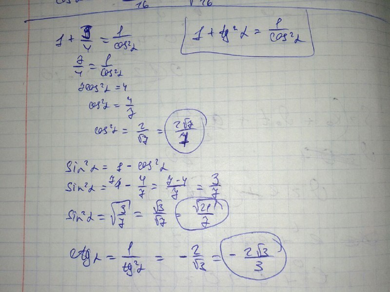 можете ли вы подтвердить правильность моих ответов. tg= -√3/2.cos=√7/2.ctg=2/√3. sin=?. cos