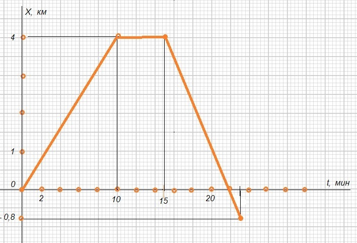 Комбайн движется равномерно и прямолинейно со скоростью 24 км/ч в течение 10 мин, затем стоит в течение 5 мин, после чего движется в обратном направлении со скоростью 36 км/ч в течение 8 мин. Изобразите характер движения комбайна на графике x = f(t).