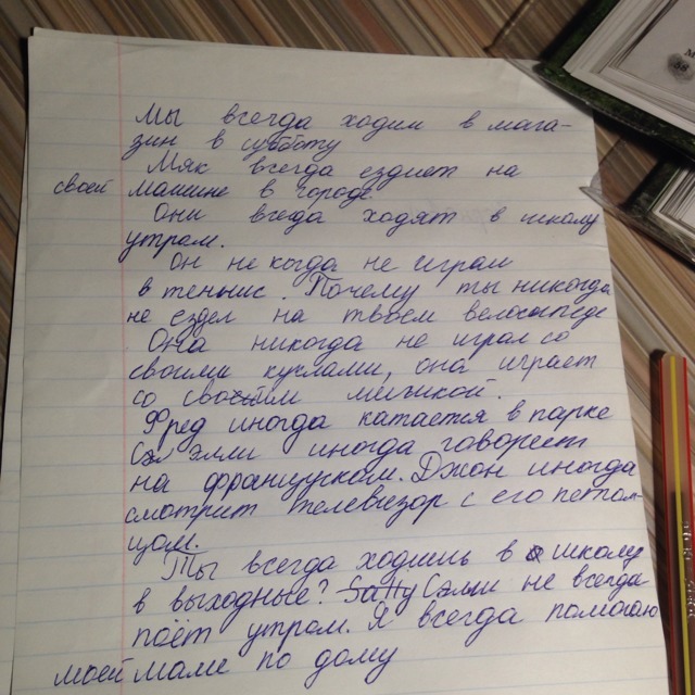 Всегда: Мы всегда идём в магазин по субботам. Майк весно едет в город на его машине. Они всегда идут в школу по утрам.